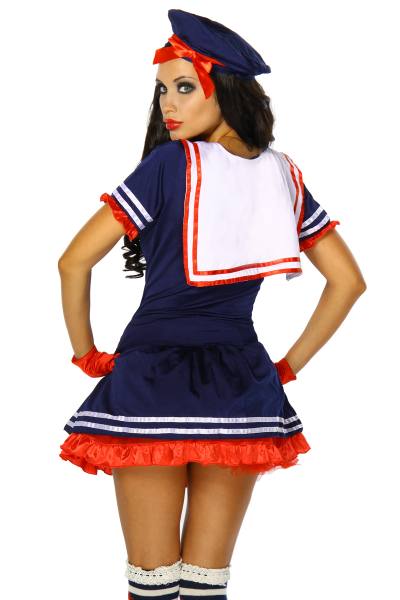 Mir dir segele ich in die blaue Lagune! Zauberhaftes elastisches Marine-Kostüm, welches jedem Seemann die Fahrt versüsst. Das Kleid hat einen typischen Matrosenkragen, Zierbänder am Rockabschluss und einen einlagigen Petticoat mit Volantabschluß eingearbeitet. Ebenfalls im Lieferumfang ist ein süsses Matrosen-Käppi und ein String. Perfekt für jede Kostüm- oder Mottoparty!